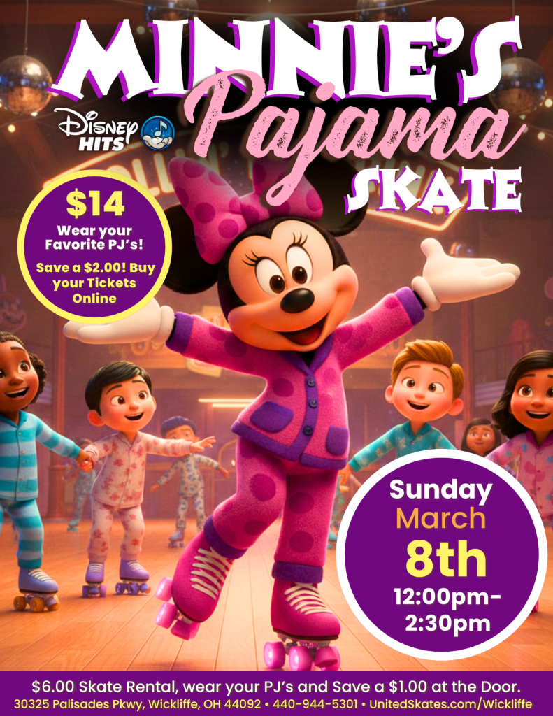 Get ready to roll into a Sunday Funday like no other! Join us at United Skates for a pajama-themed skating adventure with Minnie Mouse herself. Come dressed in your favorite PJs and skate the afternoon away with fun, music, and lots of smiles!