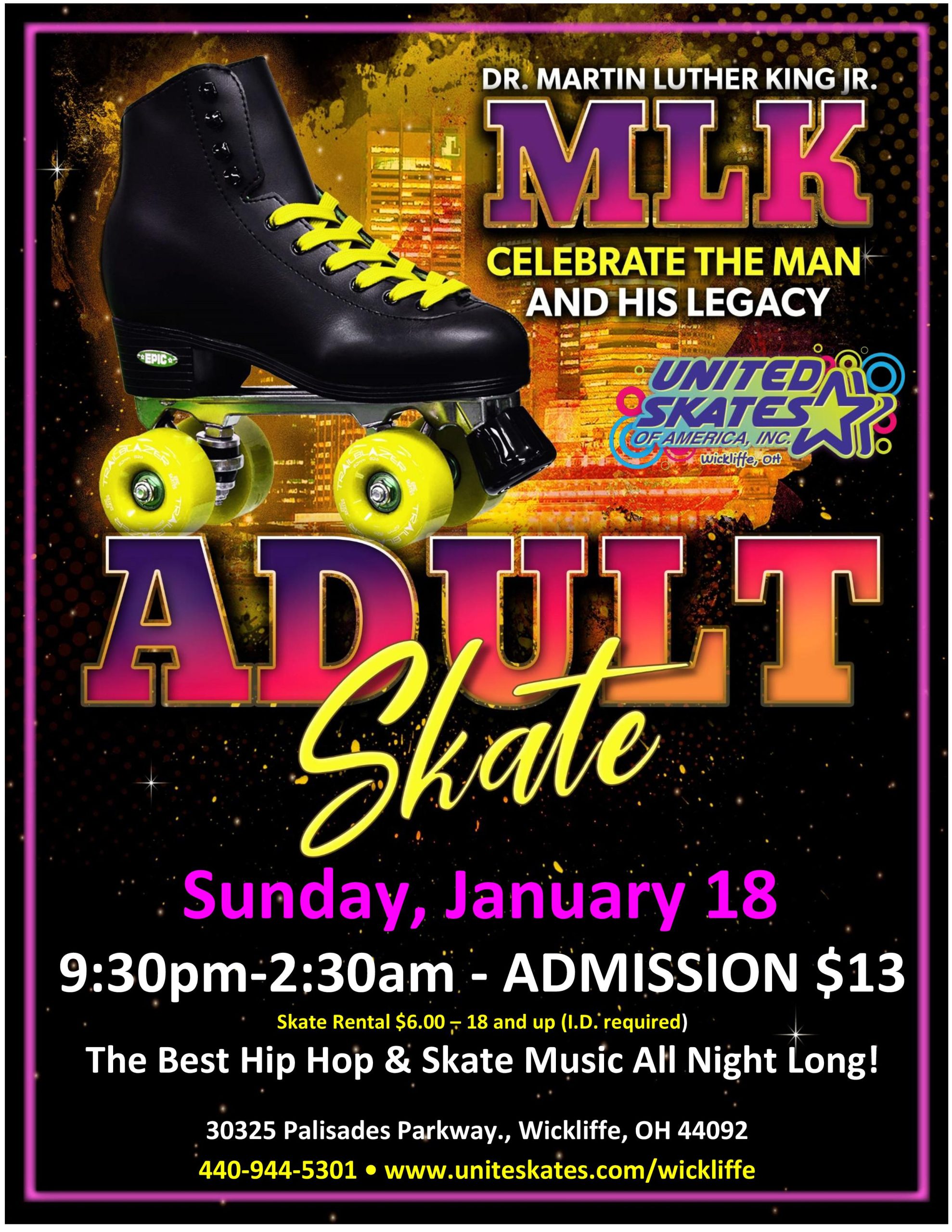 Get ready for an unforgettable night of music, lights, and nonstop skating energy! Celebrate MLK Day weekend with the ultimate Adults-Only Late Night Skate Party — where the vibes are high, the floor is smooth, and the fun lasts ALL night long!