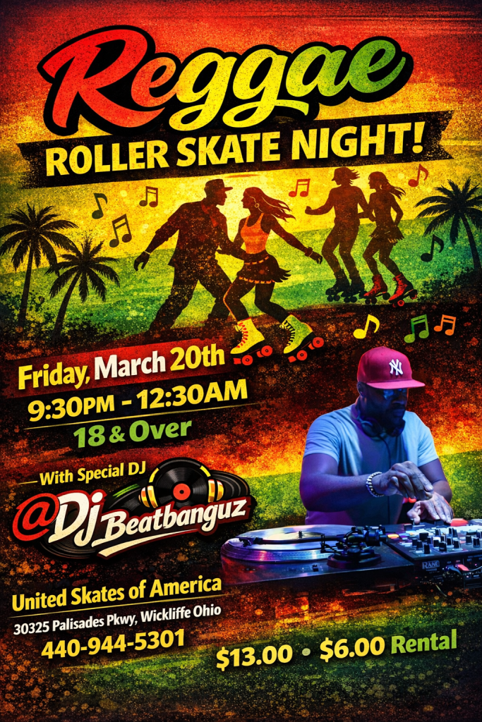 Feel the good vibes and let the rhythm move your wheels at our Reggae Adult Skate Night! Escape to a tropical paradise on skates with smooth beats and laid-back grooves thatβll have you skatinβ and swaying all night long. πΆβ¨