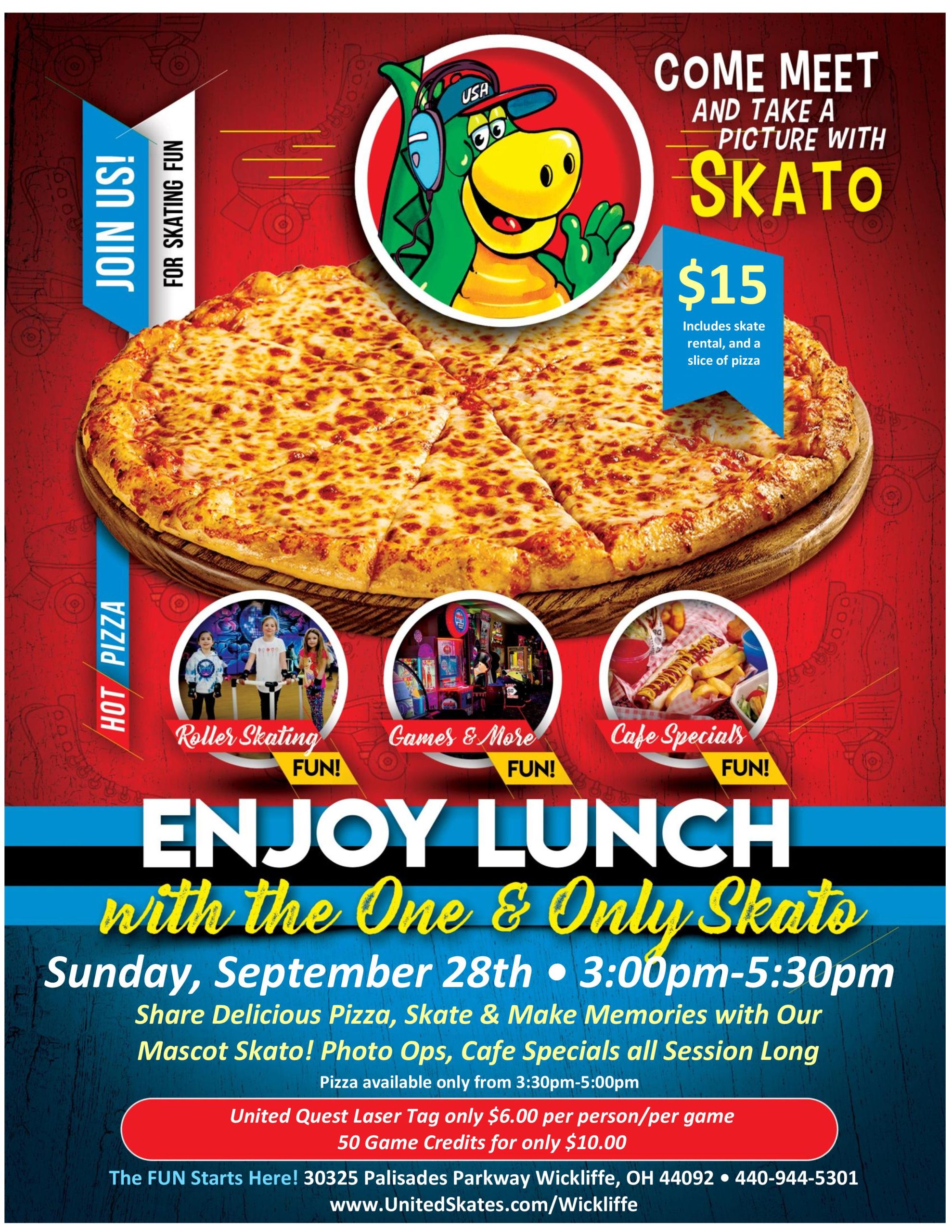 ๐๏ธ $15.00 includes admission, skate rental, and a slice of pizza