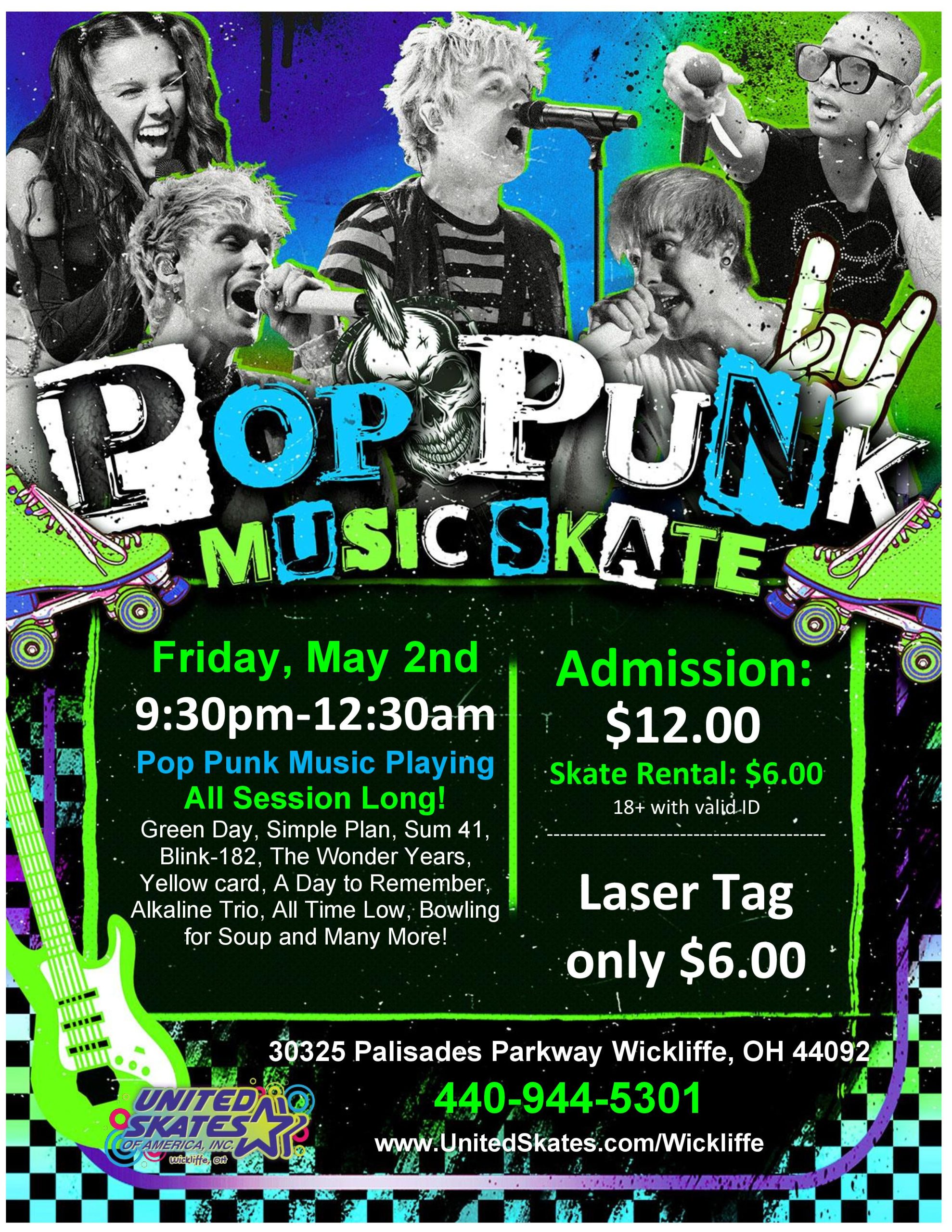 Get ready for our first-ever Pop Punk Skate! Join us for an unforgettable night filled with the best hits from Green Day, The Wonder Years, Blink-182, and many more! Friday, May 2nd 9:30pm-12:30am Admission $12.00 Skate Rental $6.00 18+ with valid ID Bring your crew and let's skate to the music that defined a generation.