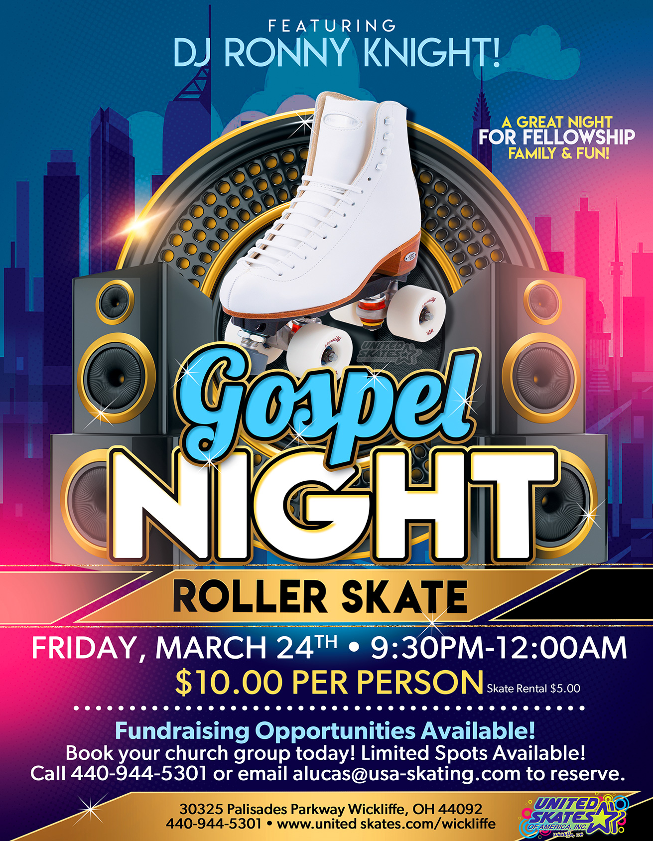 Gospel Skates are NOW Back! DJ Ronnie Knight will be playing Gospel All Night Long Admission $10.00 Skate or Rollerblade Rental $5.00 Fundraising opportunities available for all congregations! Call Amber today for more information 440-944-5301 Admission:Â *All children between the ages of 3-17 are required to pay admission skate rental upon entering. Adults 18+ not skating […]