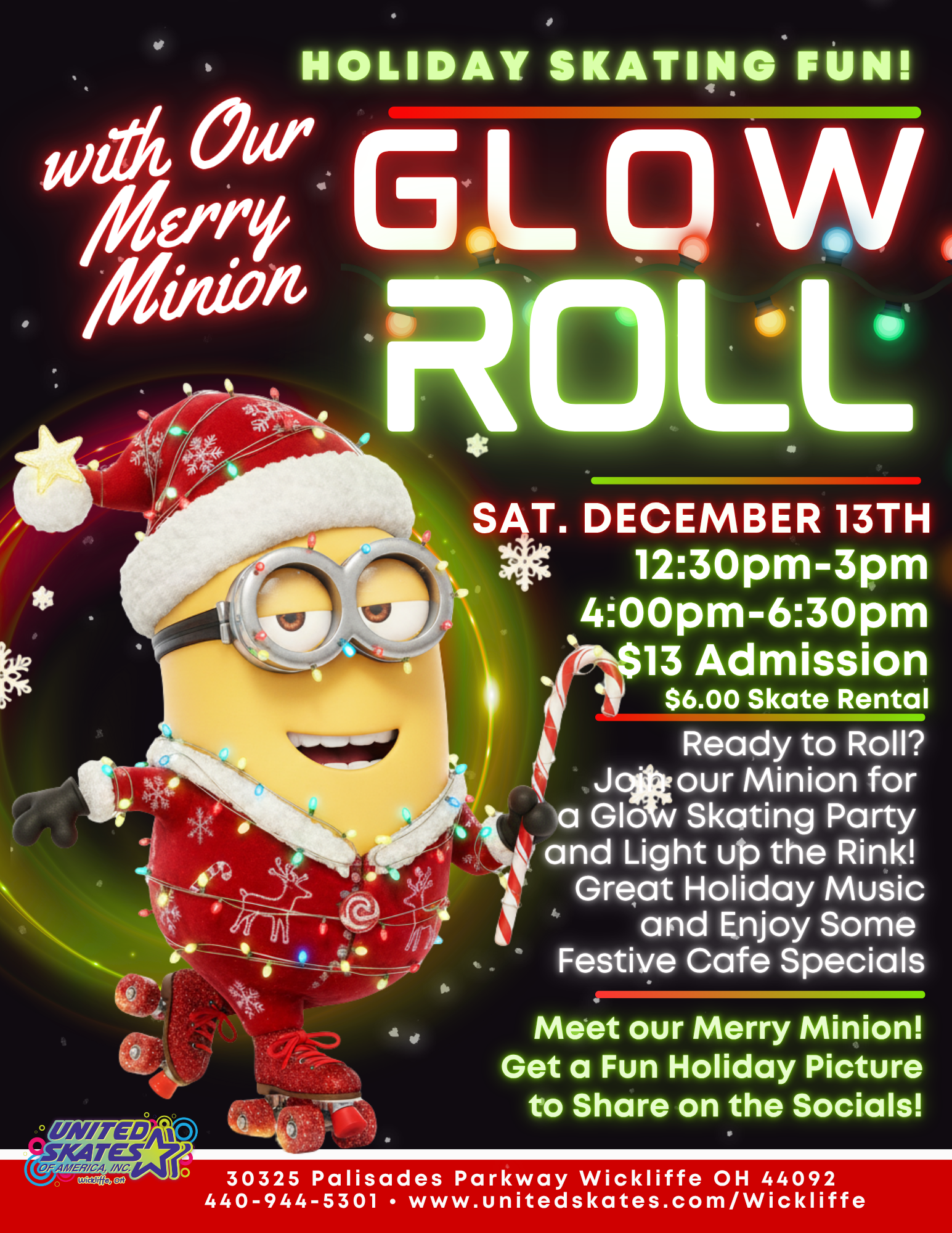 Get ready to GLOW and GO BANANAS with your favorite Minion! 🍌✨ 📅 Saturday, December 13th🕛 12:30pm–3:00pm & 4:00pm–6:30pm 🎟️ Admission: $13.00🛼 Skate Rental: $6.00💡 FREE Glow Stick with paid admission! Don’t miss this bright, cheerful, and totally MINION-tastic event! 😎💫 🎂 Book your birthday party now and have the Merry Minion join your celebration! Book Here! Save a $1.00! Buy your tickets online! BUY HERE!