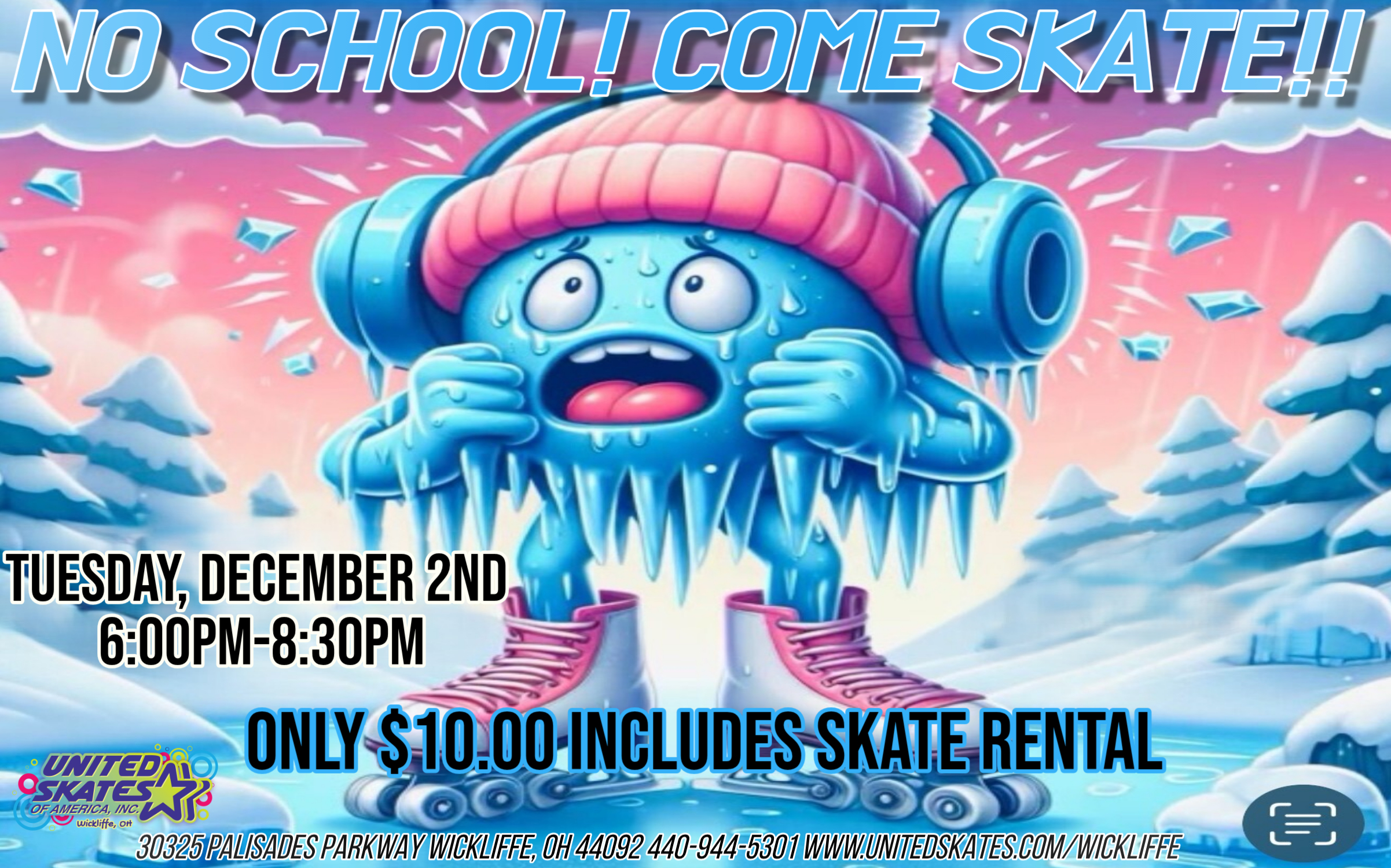 ❄️🎉 FUN • EXCITING • URGENT ANNOUNCEMENT! 🎉❄️ 🌨️☃️ IT’S A SNOW DAY!!!! ☃️🌨️ And you know what THAT means…It’s time to SKATE & CELEBRATE! 🛼❄️💙 We’re rolling out an AMAZING SNOW-DAY SPECIAL —👉 ONLY $10.00!!That’s right… Admission + Skate Rental = JUST $10.00! 😱🔥 ⭐ TONIGHT ONLY! 📅 Tuesday, December 2nd🕕 6:00pm–8:30pm Grab your […]