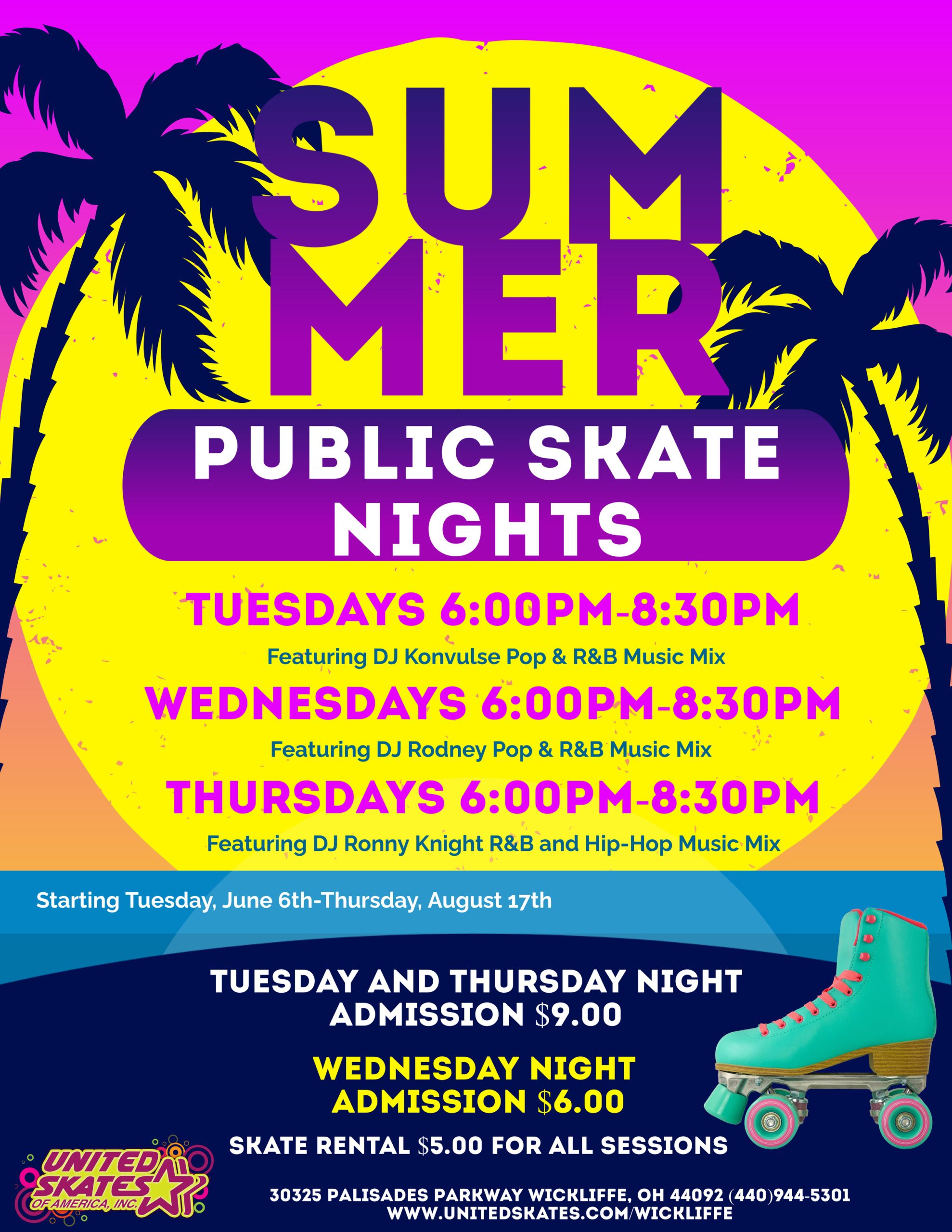 Summer Public Skate Nights/Birthday Parties Jun 6 Summer Public Skate Nights/Birthday Parties 6:00 pm - 8:30 pm Recurring
