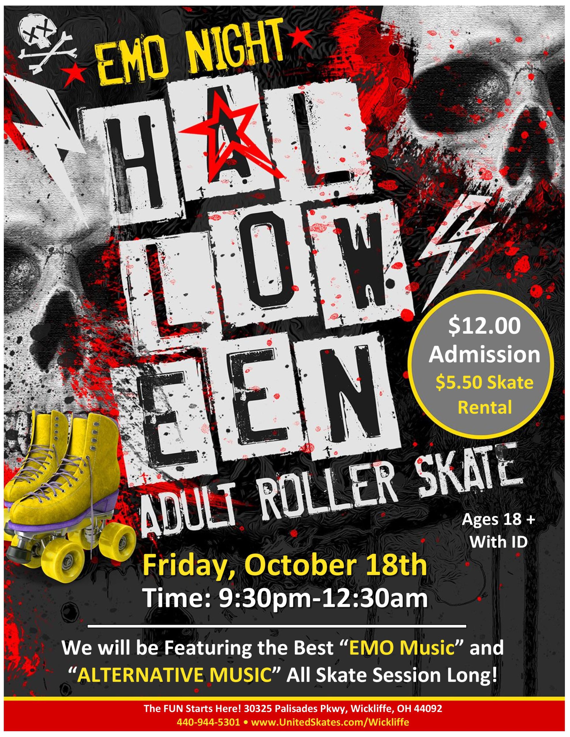 Halloween Emo Adult Skate Oct 18 Halloween Emo Adult Skate Featured October 18, 2024 @ 9:30 pm - 12:30 am