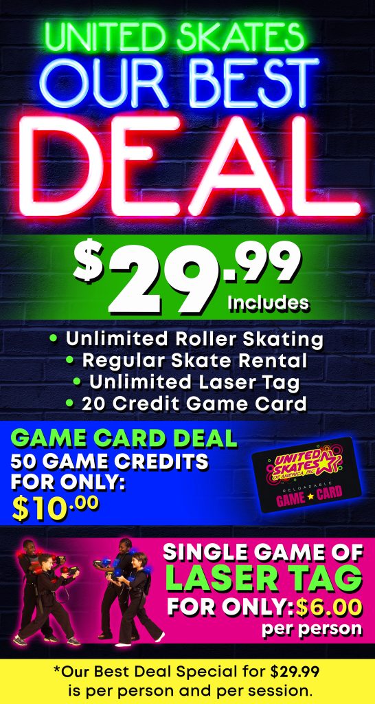 Unlimited Roller Skating, Regular Skate Rental, Unlimited Laser Tag and 20 Credit Game Card