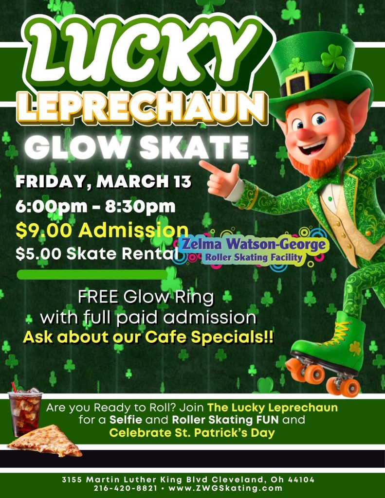 The Lucky Leprechaun Glow Skate is bringing the glow, the fun, and the St. Patrick’s Day vibes! 🌈