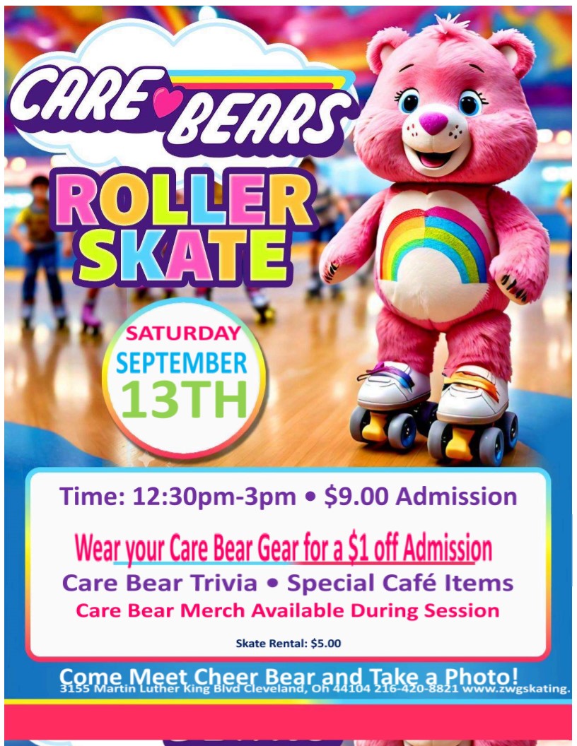 Saturday September 13th from 12:30pm-3:00pm. Special appearance by The Care Bear Wear Care Bear Gear and receive $1.00 off admission $9.00 admission $5.00 Skate Rental