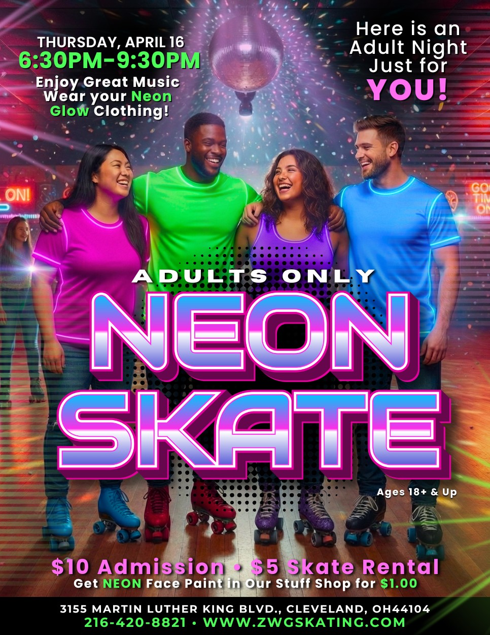 Adult Skate Night Featuring Old School R&B/HipHop Music 18&Over $10.00 admission $5.00 Skate Rental