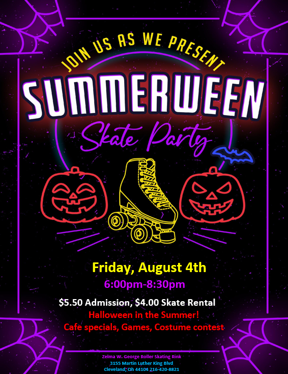 Halloween in the Summer! Cafe Specials, Games, Costume Contest! $5.50 admission (mandatory for all guest ages 17 years and under) $4.00 skate rental (mandatory for those without their own skates)